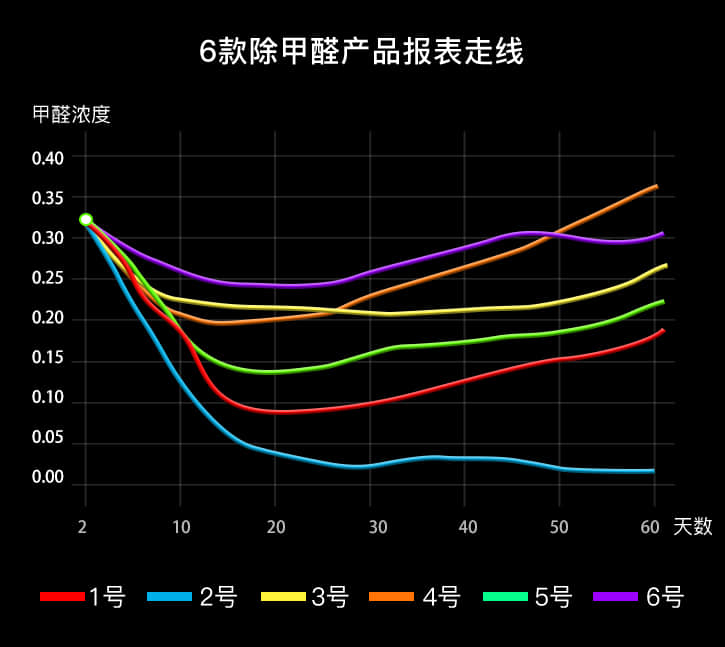 通过60天超长时间进行监测,6款除甲醛产品中,大部分都出现不同程度的反弹,只有2号这款没有反弹,证实具有深层除甲醛效果。