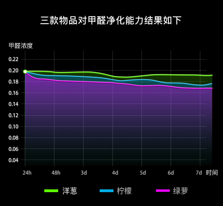 很多朋友认为绿萝,柠檬及洋葱对甲醛有很好净化效果,通过实测,我们发现效果并不理想,三种物品中绿萝净化能力相对好一点,但是在也只是在24小时内下降了0.022mg/m³,随着时间的推移,三种测试品,均没有让空间的甲醛浓度下降到安全标准